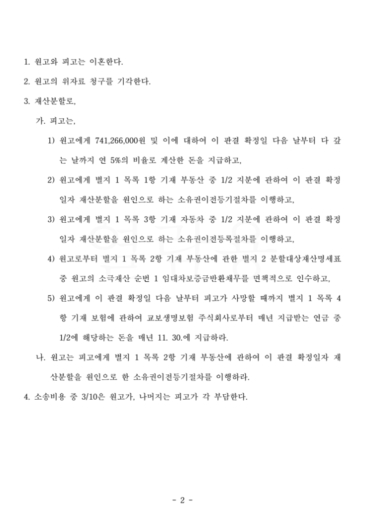 재판부는 혼인생활을 지속할 가능성이 없다고 판단하여 이혼을 선고했습니다. 특히, 가사와 육아를 전담해온 원고의 기여도를 인정하여 약 7억 4천만 원 상당의 재산분할을 명령하였습니다.