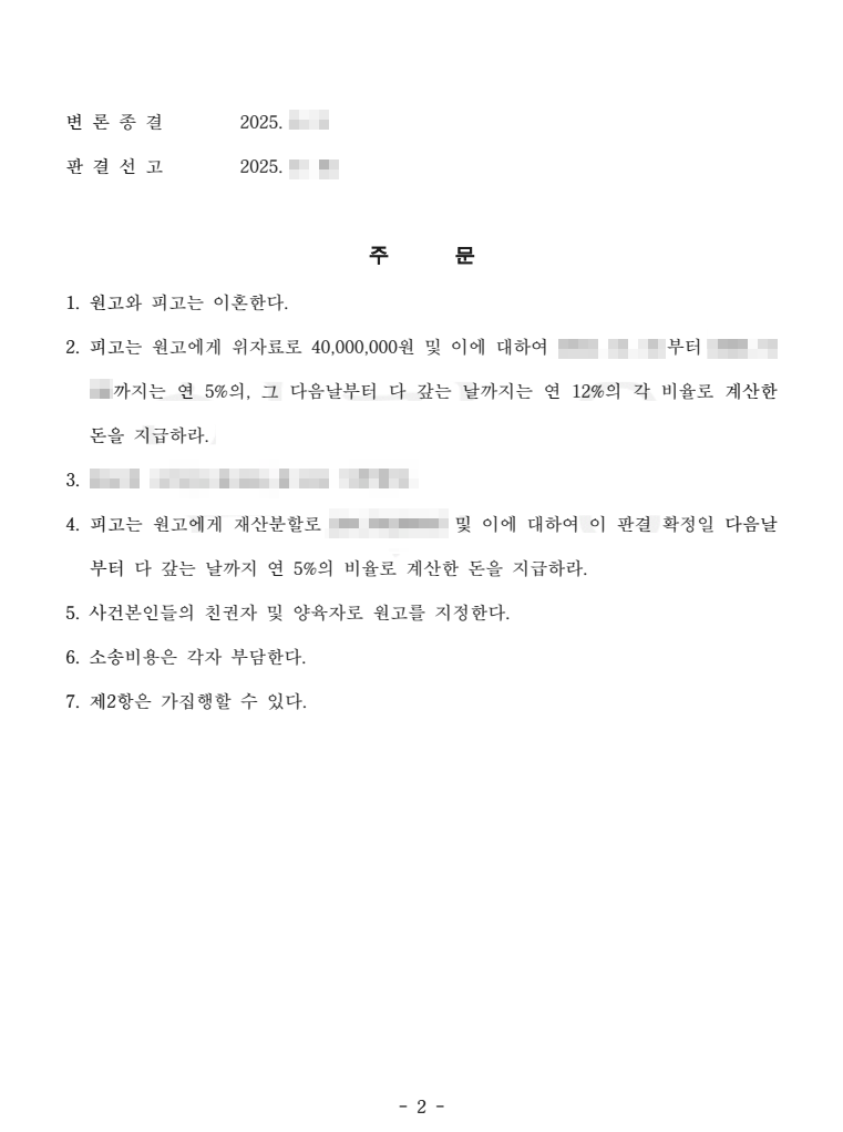 법원은 이혼을 인정하고 양육자를 원고로 지정했습니다. 위자료로 4000만원을 지급하라는 판결과 재산분할 또한 원고의 기여도를 더 높이 인정해 우리 의뢰인에게 유리하게 승소 판결하였습니다.