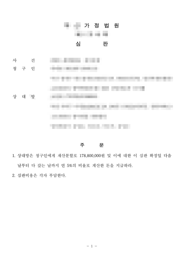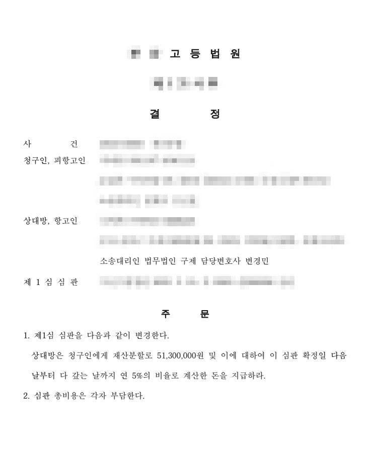 재판부는 구제의 주장을 받아들여 1심 판결을 변경했습니다. 재산분할금을 5,130만 원만 인정하며 결과적으로 의뢰인은 1억3,000만 원 가량을 지켜낼 수 있었습니다.