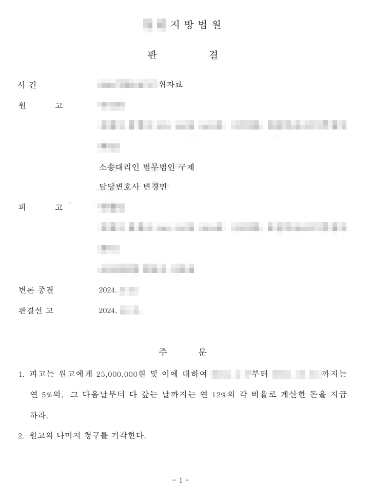 법원은 인스타그램 메시지를 통해 시작된 관계라 하더라도 실제 만남과 교제가 이어진 이상 혼인관계를 침해한 부정행위에 해당한다고 판단했습니다. 특히 상간녀가 남편의 혼인 사실을 충분히 인지하고도 관계를 지속한 점을 고려하여 책임을 인정했습니다. 그 결과 피고는 의뢰인에게 위자료 2,500만 원을 지급하라는 판결을 받게 되었고, 의뢰인은 정신적 고통에 대한 법적 책임을 명확히 인정받을 수 있었습니다.