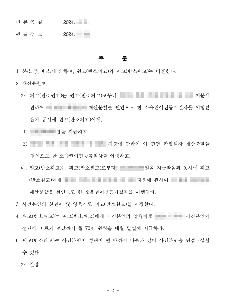 법원은 우리의 주장을 받아들여 자녀의 친권자 및 양육자를 우리 의뢰인으로 지정했습니다. 또한 혼인 기간 동안 의뢰인이 주된 경제활동을 담당해온 점과 상대방의 기여도를 종합해, 상대방이 청구한 재산분할 비율을 기존 주장 대비 5분의 1 수준으로 대폭 제한하였습니다. 그 결과 의뢰인은 자녀와의 안정적인 생활 기반을 지키는 동시에, 과도한 재산분할 부담에서 벗어날 수 있었습니다.