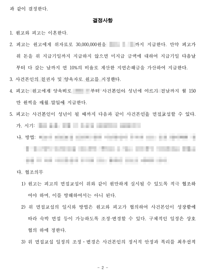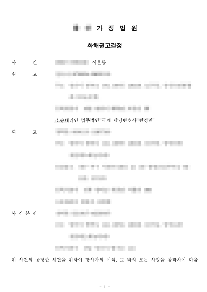 법원은 화해권고결정을 통해 사건을 상대적으로 조기에 종결하였고, 의뢰인은 위자료 3,000만 원을 지급받았습니다. 또한 양육권과 양육비 역시 모두 의뢰인이 원하는 방향으로 확정되었습니다. 의뢰인은 불필요한 소송 부담 없이 빠르게 안정된 생활로 복귀할 수 있었습니다.