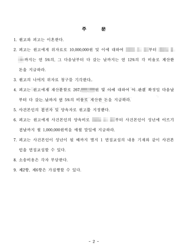 법원은 혼인관계 파탄의 책임을 인정하여 이혼을 인용하고, 의뢰인에게 위자료와 함께 약 2억 7천만 원의 재산분할을 인정하였습니다. 이를 통해 의뢰인과 자녀는 폭력적인 환경에서 벗어나 보다 안전하고 안정적인 생활 기반을 마련할 수 있게 되었습니다.