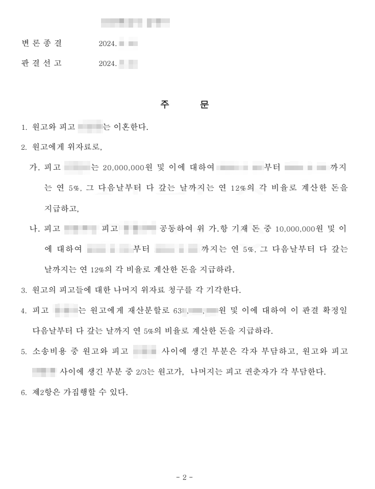 법원은 혼인관계 파탄의 근본적 책임이 전남편에게 있음을 인정함과 동시에, 상간자의 공동 불법행위 책임을 받아들여 위자료 2000만 원 지급을 명령했습니다. 또한 의뢰인이 시부모를 병간호하며 장기간 가사노동을 이어온 것이 재산형성에 크게 기여하였다고 평가하였습니다. 그 결과 우리 의뢰인은 재산분할에서 약 6억3천만 원을 지급받으며 오랜 희생에 대한 법적 보상과 함께 안정적인 삶의 기반을 마련할 수 있게 되었습니다.