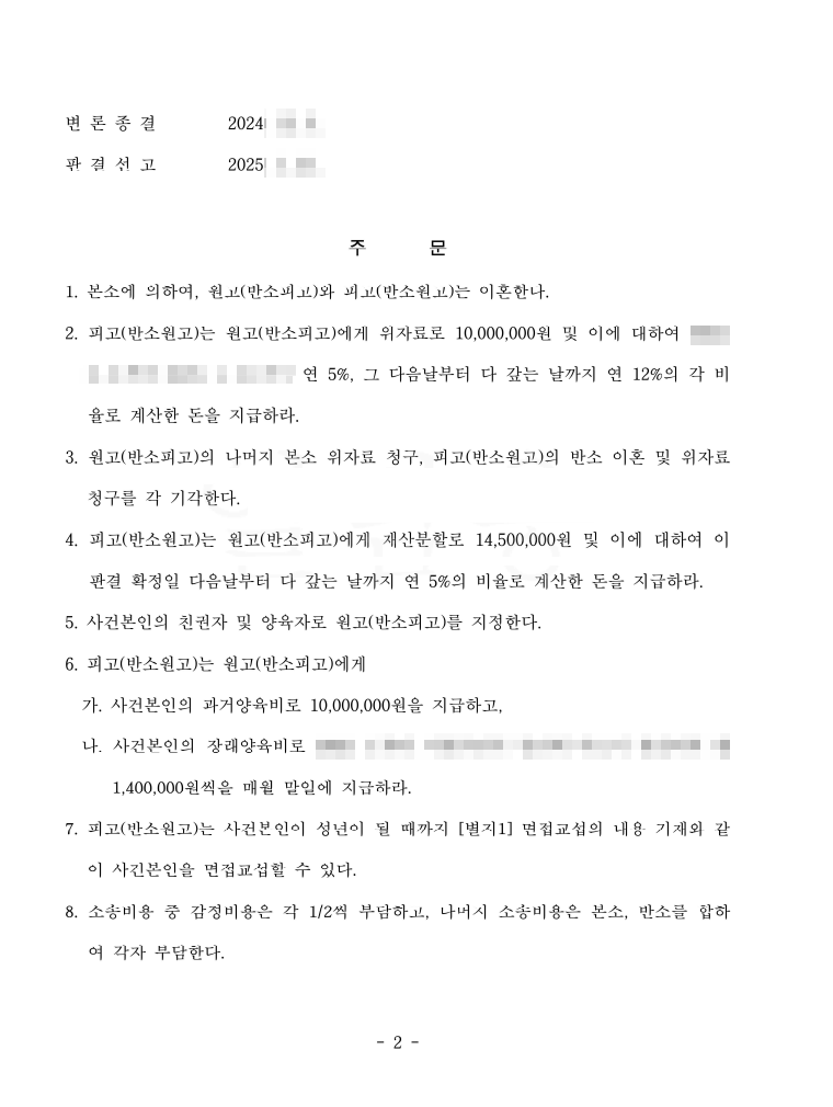 상대방의 청구는 모두 기각되었으며, 자녀의 친권자와 양육권 또한 의뢰인에게 귀속되어 우리 의뢰인에게 유리한 승소 판결을 받았습니다.